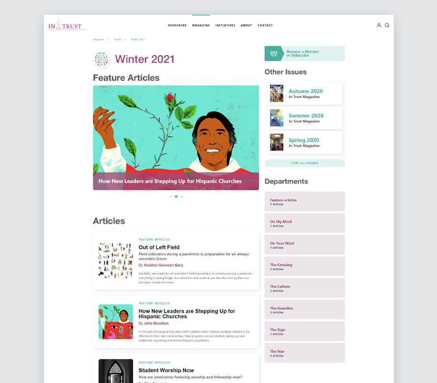 SteadyRain partnered with the In Trust Center for Theological Schools for an impactful web solution to better serve the organization’s members and gain additional interest of potential members. Planned website additions included a searchable archive of In Trust’s magazine, enhanced digital content organization and refined URL strategies for improved search engine optimization.
